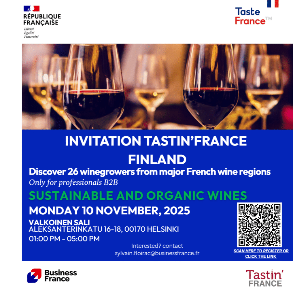 Business France Nordic, the public consulting firm that supports the international development of the French economy, would like to invite you to our professional wine tasting event “TASTIN’FRANCE FINLAND” on the 10th of November in Helsinki. The event will take place at Valkoinen Sali (Aleksanterinkatu 16-18) on Monday 10th of November from 1pm to 5pm and is BtoB only.